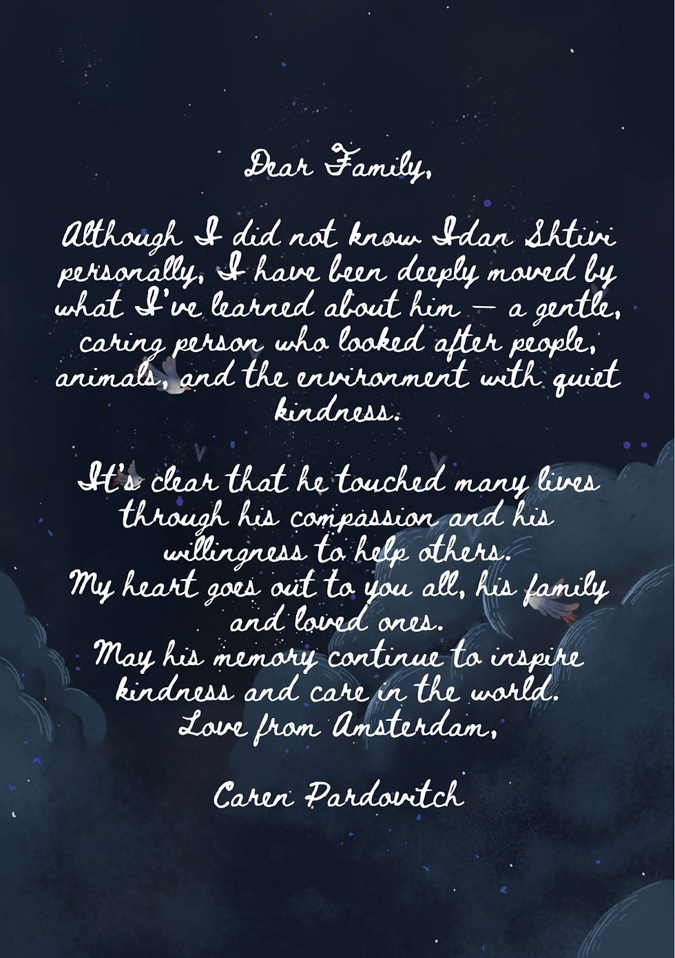 Idan’s partner, Stav, describes him as a person with a quiet and profound presence who always cares about what's happening around him: his friends, family, animals, and the environment. He is full of hope for a better and more beautiful world.